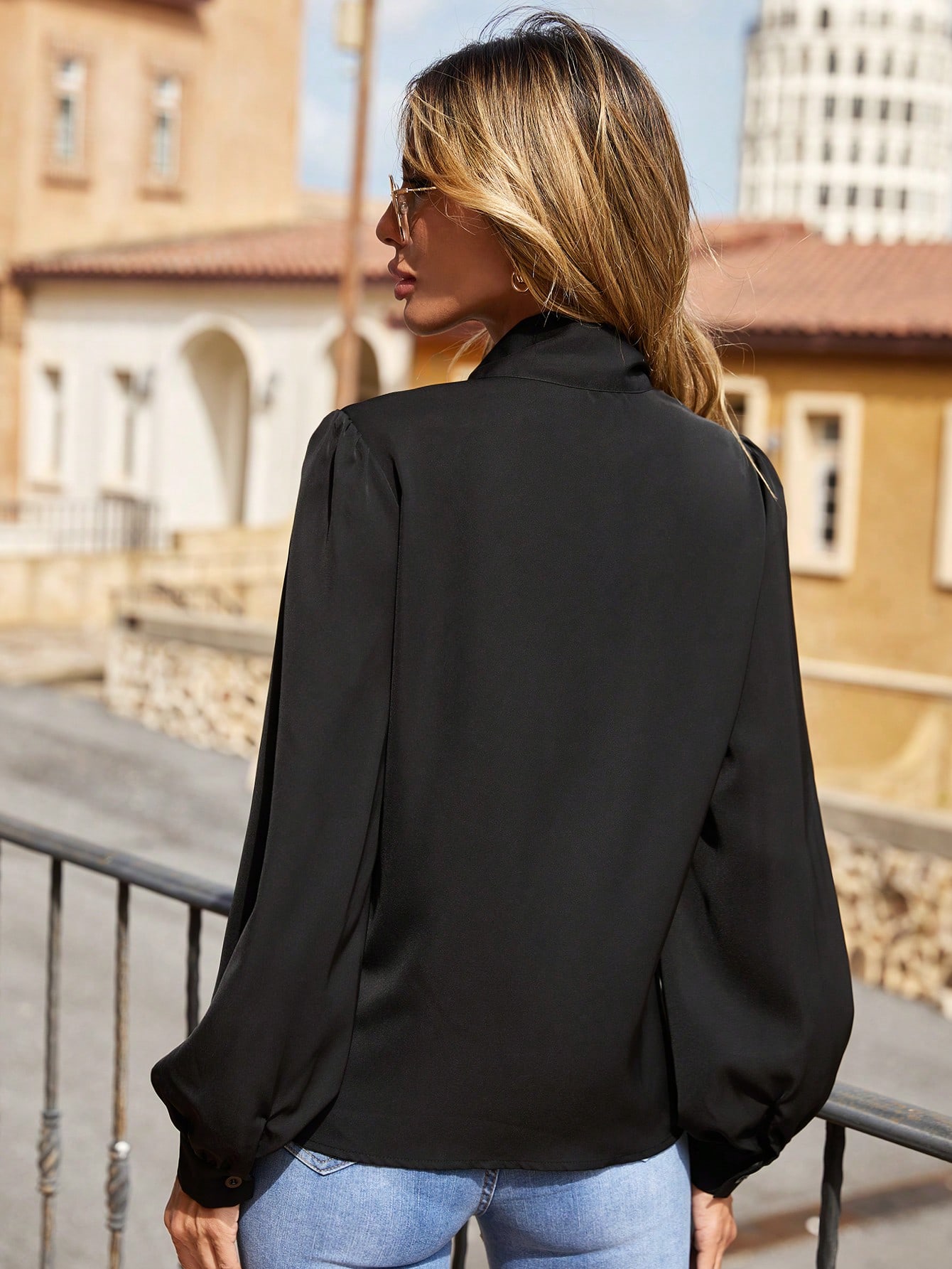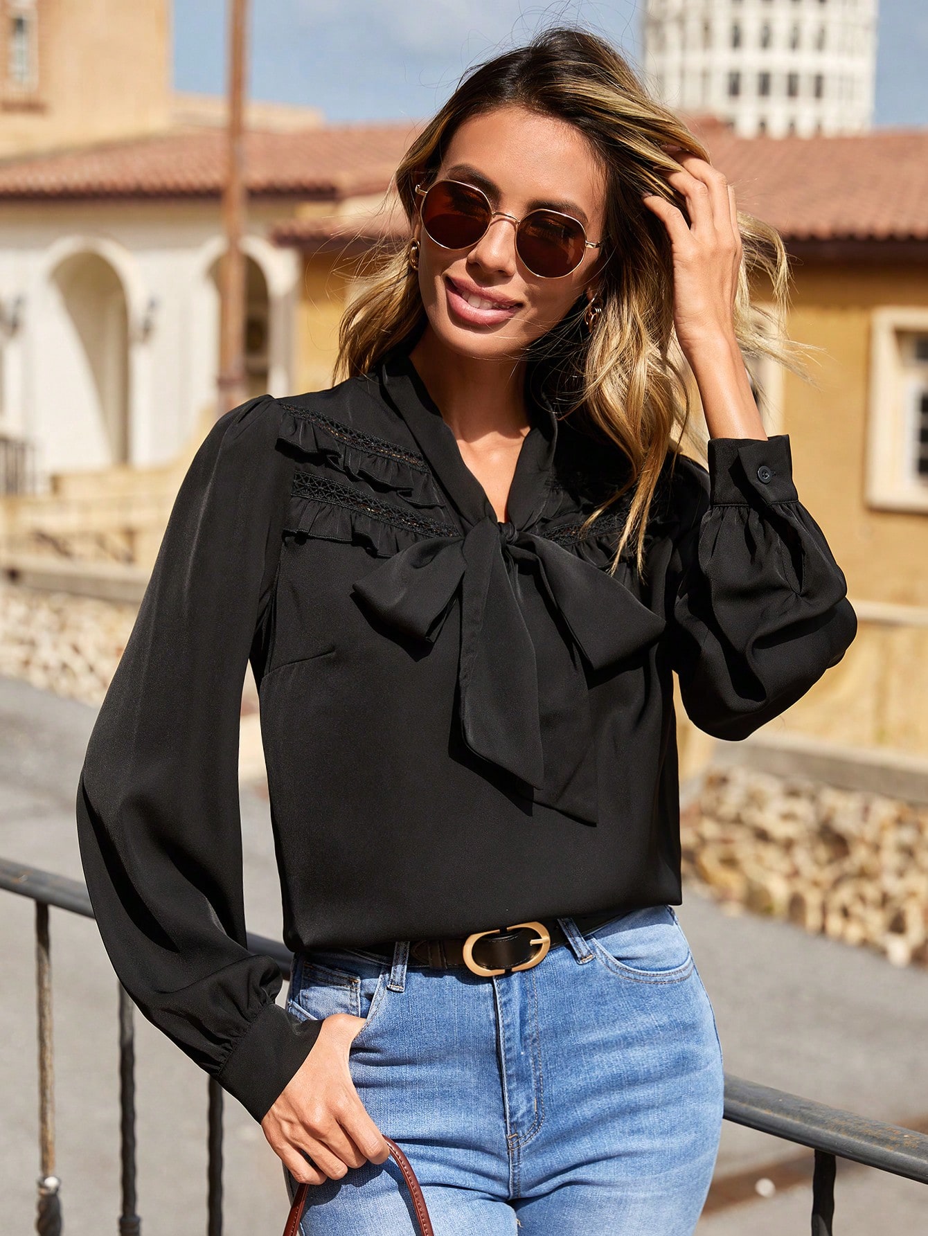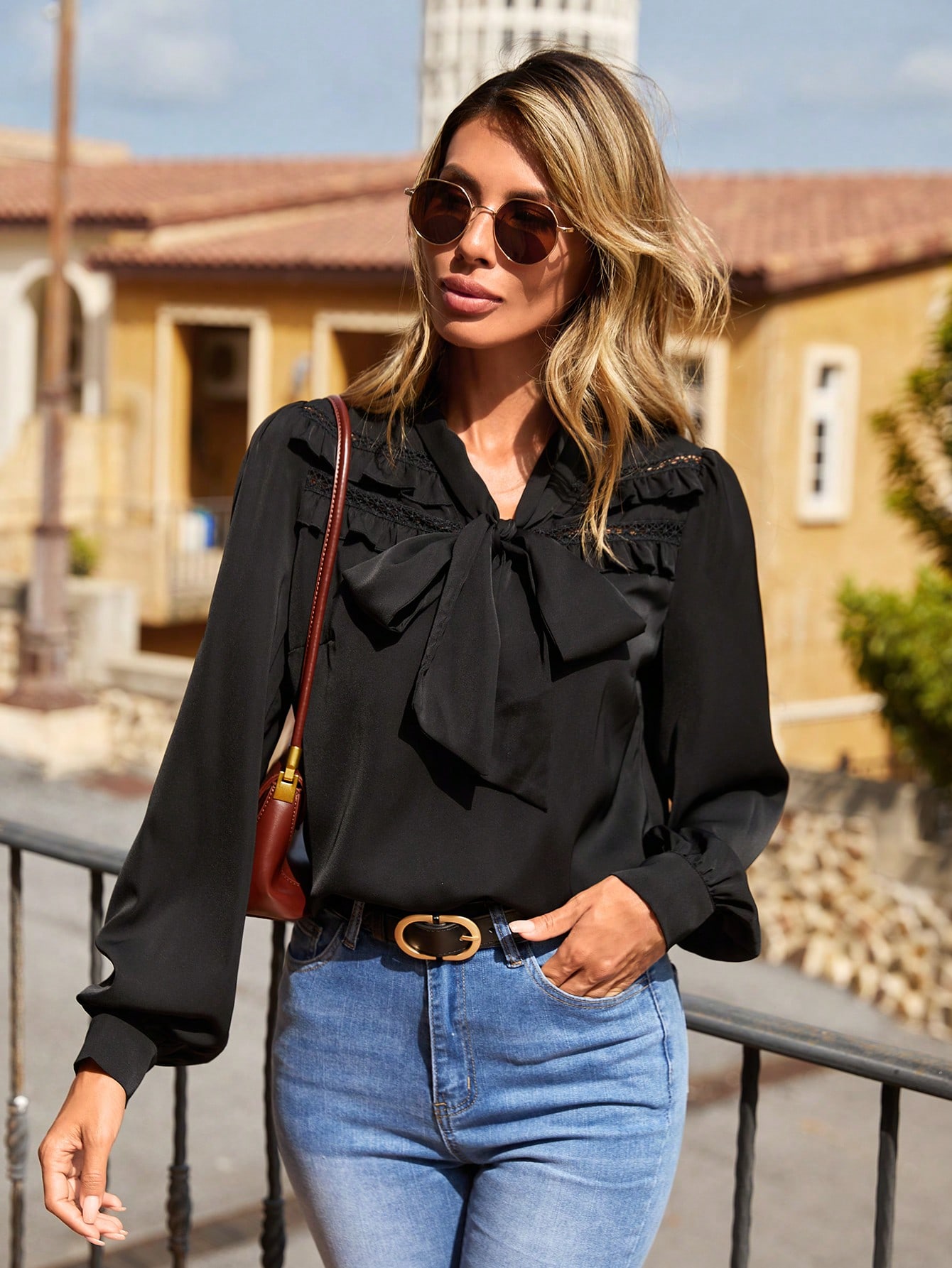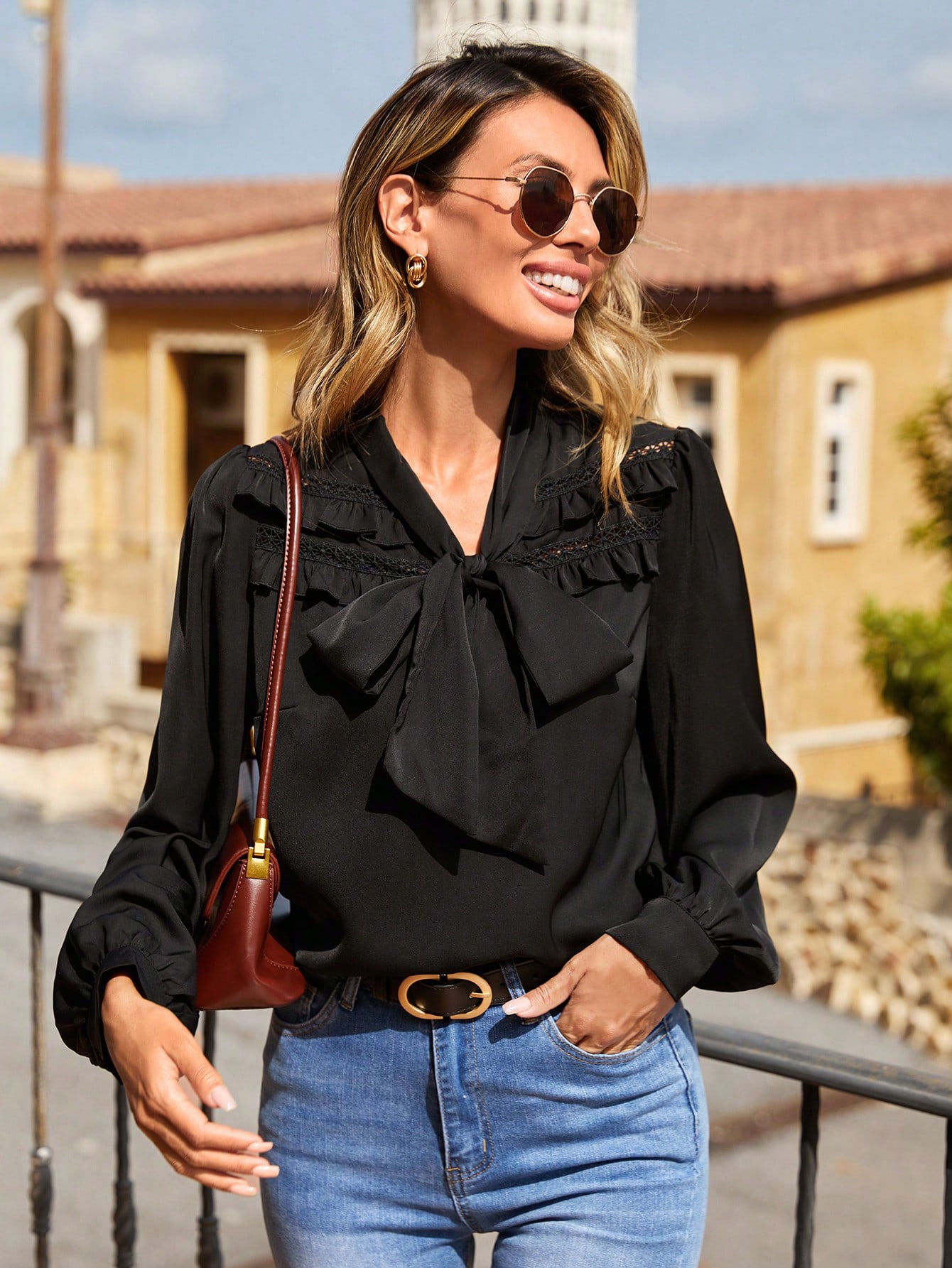 Tie Neck Lace Yoke Lantern Sleeve Top
