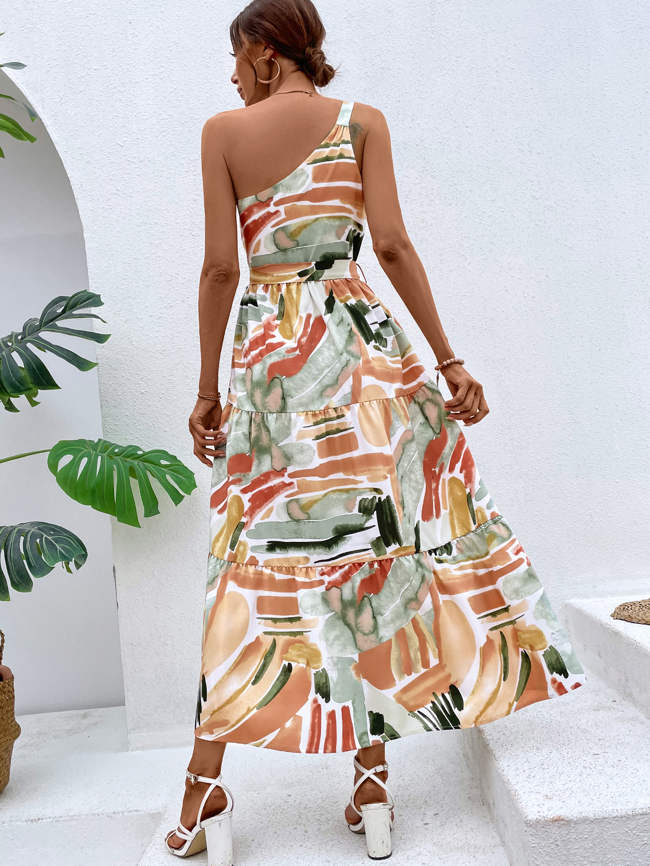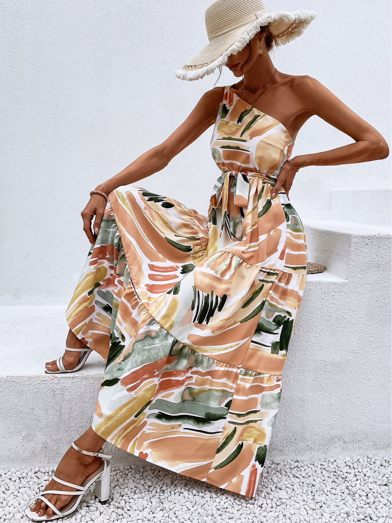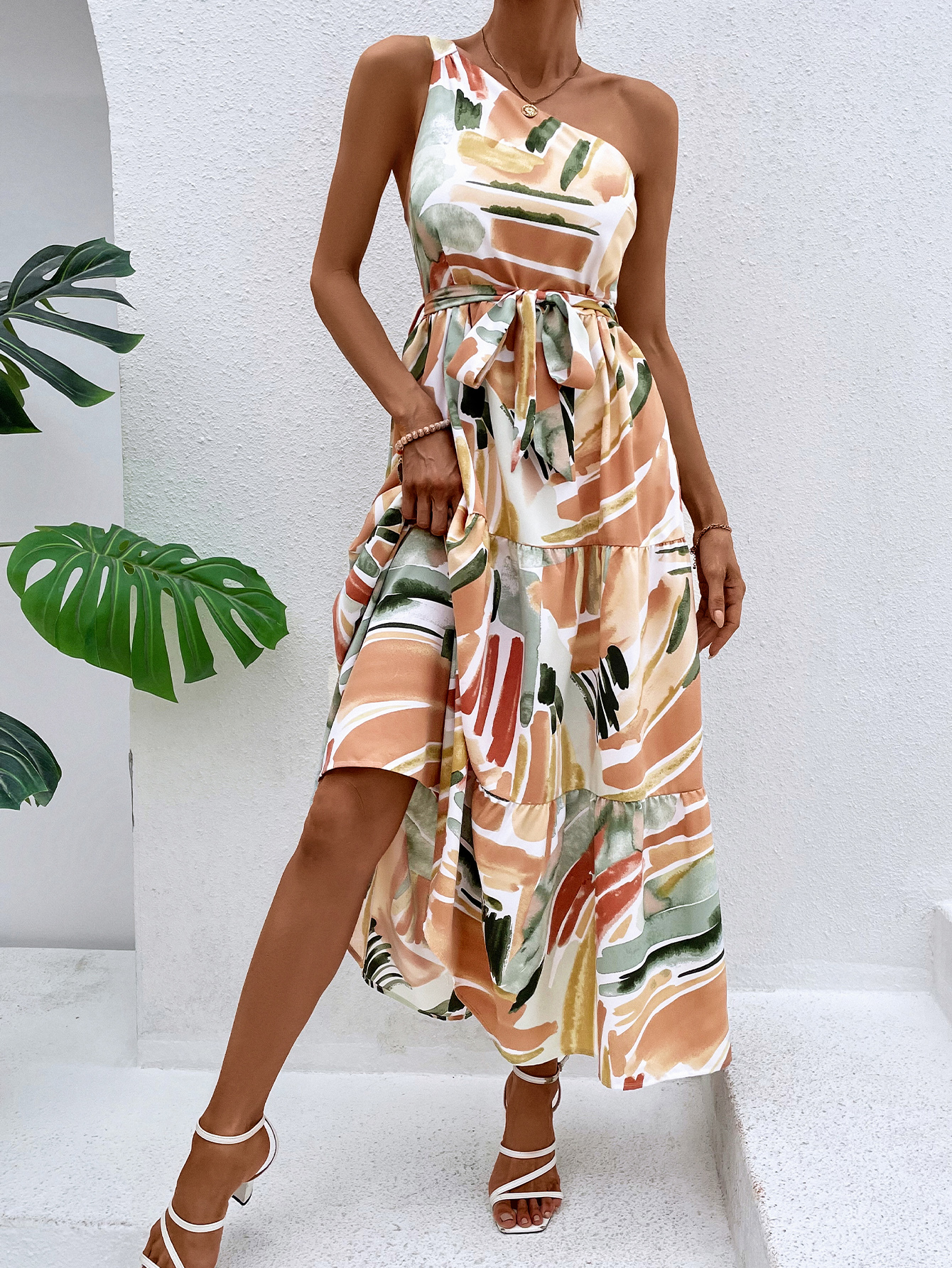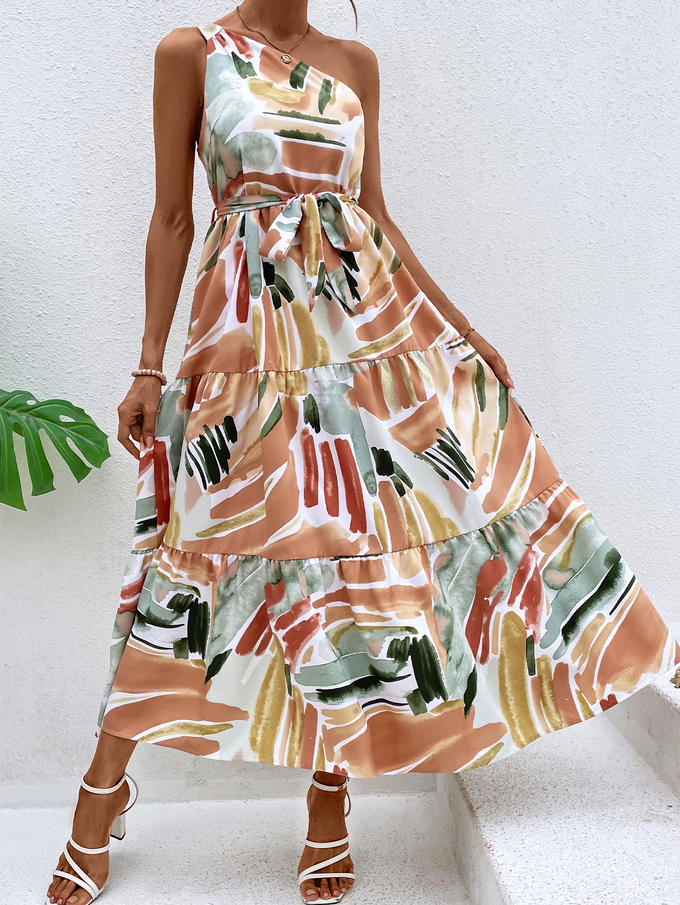 Brush Print Belted Ruffle Hem Dress